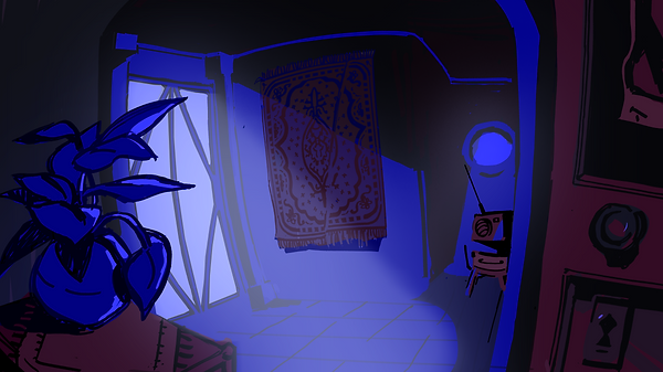 A collection of background paintings I made for the film in the final color scheme. Blue and red is heavily characterised throughout the film.